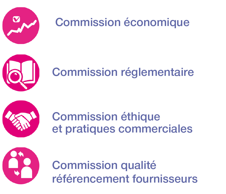Quatre Commissions, instances techniques, étudient, de façon permanente ou en fonction des questions d’actualité, les principaux sujets intéressant le secteur dentaire. Elles apportent leur expertise et proposent des réponses et actions.